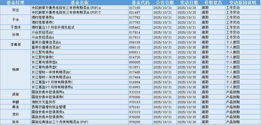 根据巨灵统计的数据显示点点策略网,近30天(10.2-10.31)共有406只基金产品的基金经理发生离职变动。其中今天(10.31)有24只基金产品发布基金经理离职公告,从变动原因上来看,有4位基金经理是由于工作变动而从管理的7只基金产品中离职,有5位基金经理是由于产品到期而从管理的7只基金产品中离职。有2位基金经理是由于个人原因而从管理的10只基金产品中离职