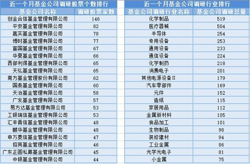 近一个月(10月2日-10月31日),创金合信基金参与公司调研的数量最多,共调研146家上市公司,然后调研较为活跃的还有平安基金、嘉实基金和博时基金,分别调研82家、78家、77家上市公司;从调研行业上来看,基金公司对化学制品行业的上市公司调研次数最多,共有519次,其次是医疗器械行业,基金公司调研了504次。