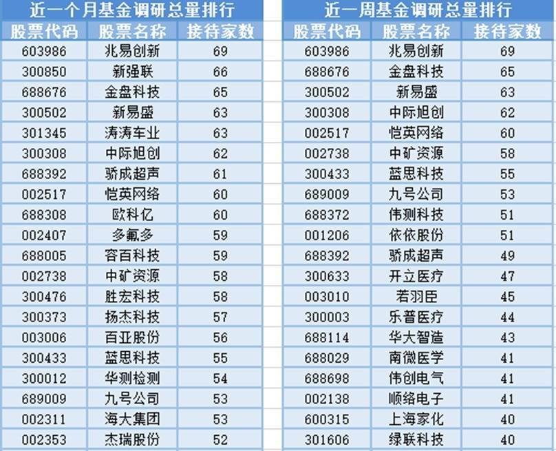 兆易创新,属于半导体行业,主营业务为存储器、微控制器、传感器和模拟芯片的研发、技术支持和销售。共有69家基金管理公司参与调研,其次是新强联和金盘科技,分别接受66家、65家基金管理公司的调研。